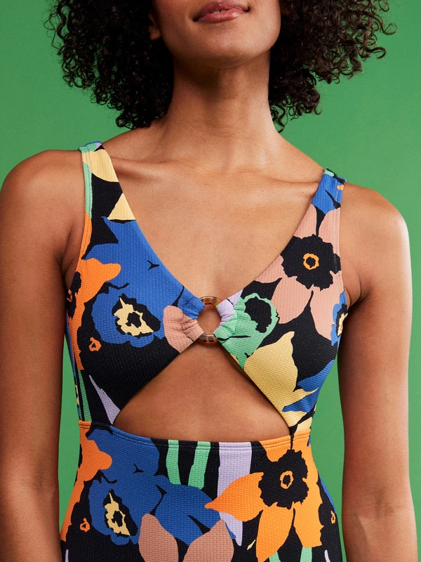Crafted from a textured blend of recycled stretch fabric, the Color Jam printed one-piece swimsuit elevates a classic fixed-strap design with a front cut-out and an O-ring at the center.